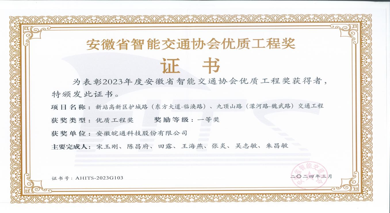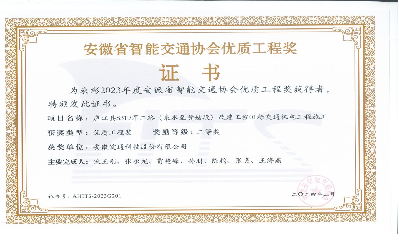 近日,由安徽省智能交通协会开展的2023年度智能交通协会科学技术奖暨优质工程奖评审工作圆满结束,经审定批准,乐天堂fun88集团申报的“新站高新区护城路(东方大道-临涣路)、九顶山路(濛河路-魏武路)交通工程”与“庐江县S319军二路(泉水至黄姑段)改建工程01标交通机电工程施工”分别荣获安徽省智能交通协会优质工程奖一等奖、二等奖。